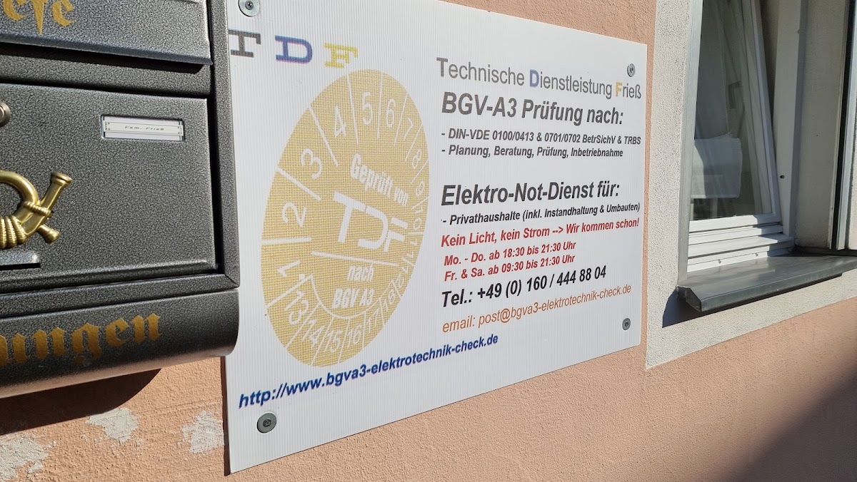 TDF - Techn. Dienstleistung Frieß - Elektro-Notdienst, Planung & Instandhaltung, BGV-A3 Prüfung