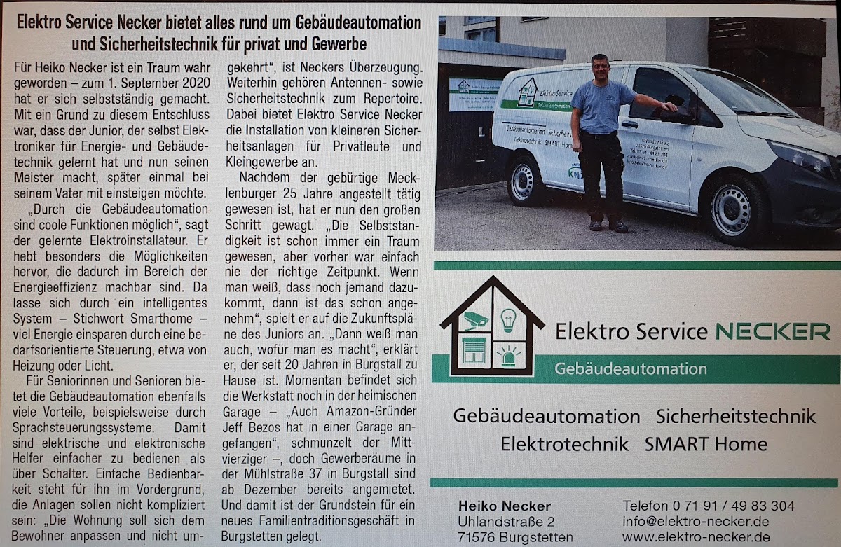 Elektro Service Necker ist Ihr kompetenter Ansprechpartner für alle elektrotechnischen Dienstleistungen in Burgstetten und Umgebung. Mit Sitz in der Mühlstraße 37, 71576 Burgstetten, bietet das Unternehmen professionelle Lösungen für Privat- und Gewerbekunden – von der Installation bis zur Wartung.