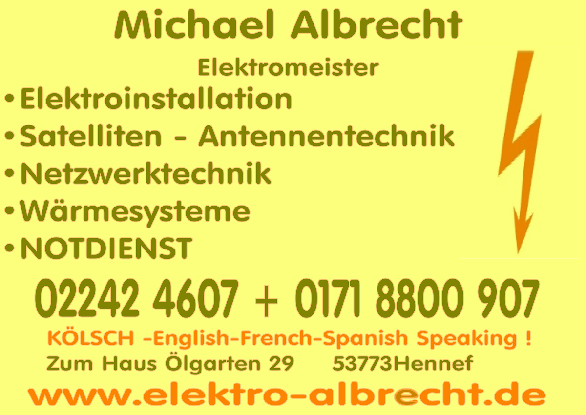 Elektro Albrecht ist Ihr professioneller Ansprechpartner für alle elektrotechnischen Dienstleistungen in Hennef (Sieg) und Umgebung. Mit Sitz in der Im Tiefen Bruch 10, 53773 Hennef (Sieg), überzeugt das Unternehmen durch höchste Qualität, schnelle Verfügbarkeit und faire Preise.